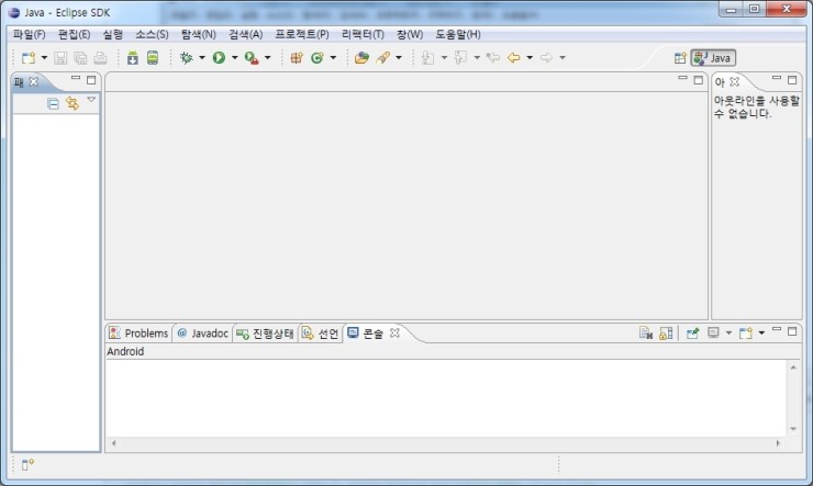 이제 이클립스를 실행하면 한글로 된 메뉴를 보실 수 있습니다.