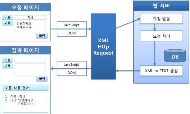 - 웹 서버는 XMLHttpRequest로부터의 요청을 알맞게 처리후 결과를 XML이나 단순 Text을 생성해서 XMLHttpRequest에 전송