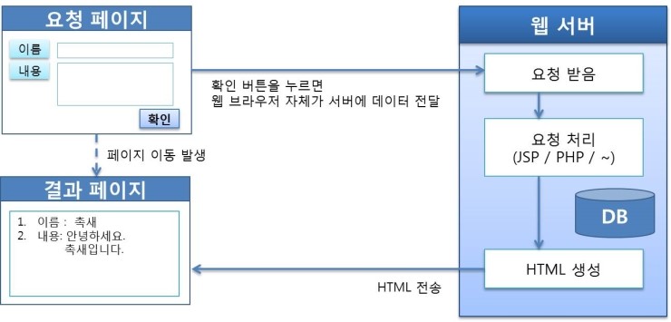 - 결과적으로 웹 브라우저가 웹 서버와 통신을 하고 요청 결과는 HTML로 생성되고 사용 입장에서는 페이지 이동이 생함