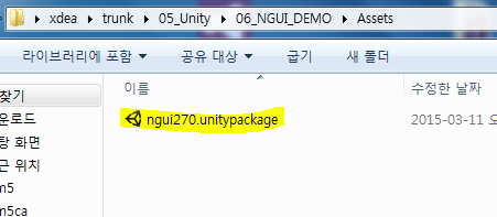 8. 프로젝트가 새로 생성되면서 유니티가 재시작 될 것이다. 다운받은 Demo버전 NGUI를 아까 만들었던 폴더 내의 Assets폴더에 넣어준다.