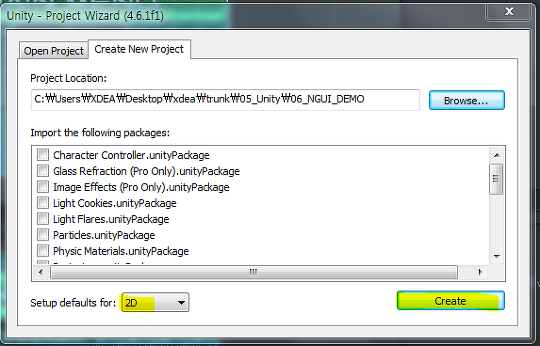 7. NGUI는 2D 기반이므로 Setup defaults for : 2D로 설정해주고 Create를 눌러준다.