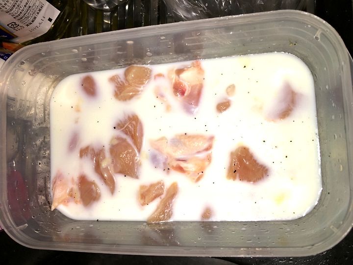 1. 우유 + 닭(찬물에 씻어서) + 후추(3번 툭툭툭~) + 소금(1스푼)