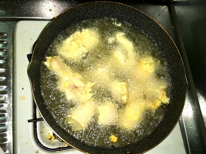 2. 기름이 치킨을 거의 다 덮을 수 있도록 넣고 중불로 가열 합니다.(건더기당 5분 가열하면 딱!)