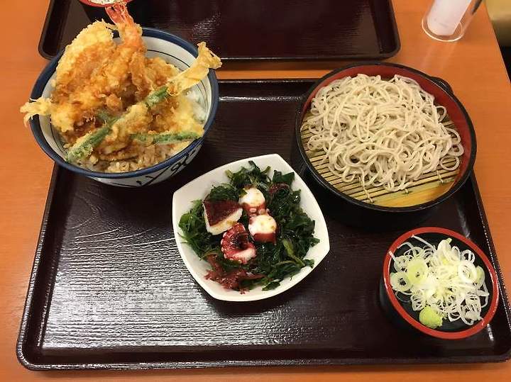 그리고 면허증 뽑고 돌아오는 길에 먹은 텐동 + 소바 + 문어반찬(130엔)